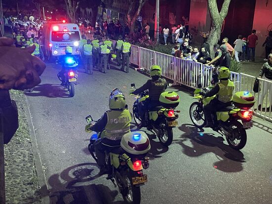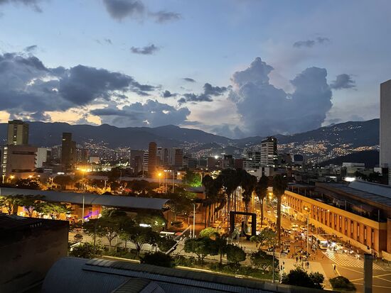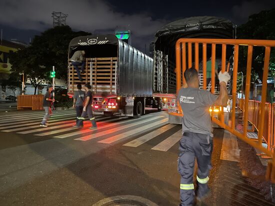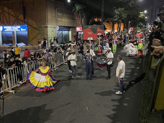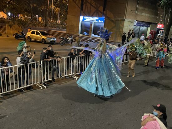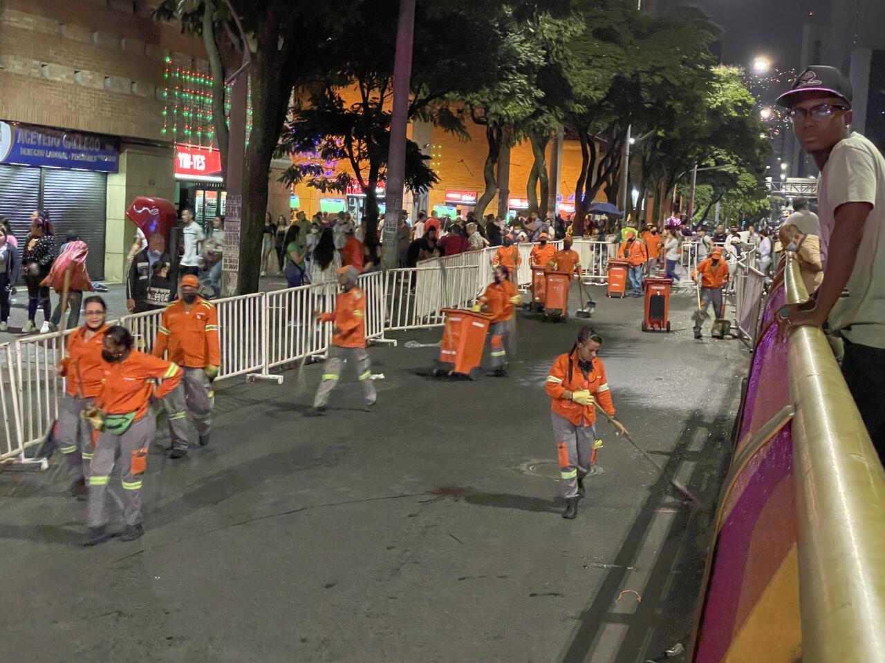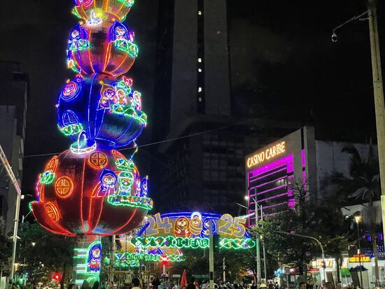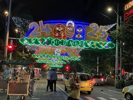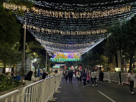 Weil ich jetzt eh schon auf der Strasse bin und mein Handy fest im Griff habe, gehe ich der abgesperrten Strasse entlang zurück, dahin, von wo der Umzug kam. Bald bin ich wieder beim Coltejo-Gebäude. Dort wo ich vorgestern die grossen Weihnachtsdekorationen gesehen habe. Und jetzt leuchten sie. Also doch. Jetzt ist es eben doch eine Weihnachtsbeleuchtung. Einfach nicht so wie ich mir das vorgestellt habe. Viel schriller, pompöser, viel farbiger. Ich laufe noch eine Weile unter den Bäumen hindurch, bis ich umkehre. Und auf dem Rückweg sehe ich, dass auch der Aufräumservice inzwischen in der Endphase ist. Alle Absperrungen werden in Lastwagen geladen. Ganze Equipen sind unterwegs. Morgen wird es aussehen, als ob da nie was gewesen wäre auf den Strassen von Medellin.