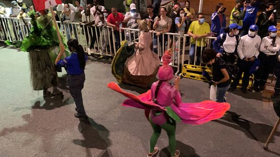 Da unten ist der Verkehr gestoppt. Eine grosse Musiktruppe spielt. Die Tambouren schlagen den Takt, es dröhnt zwischen den Mauern. Ich drücke auf den Auflöser, will alles festhalten. Dann marschiert die Musik vorwärts. Doch jetzt rollt nicht etwa der Verkehr wieder, jetzt kommt eine einzelne Figur in einem blauen wehenden Kostüm. Und noch ein. Das ist ein Umzug. Und er hat erst grad angefangen.