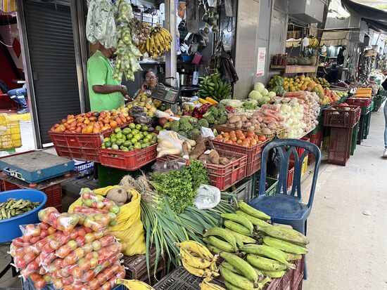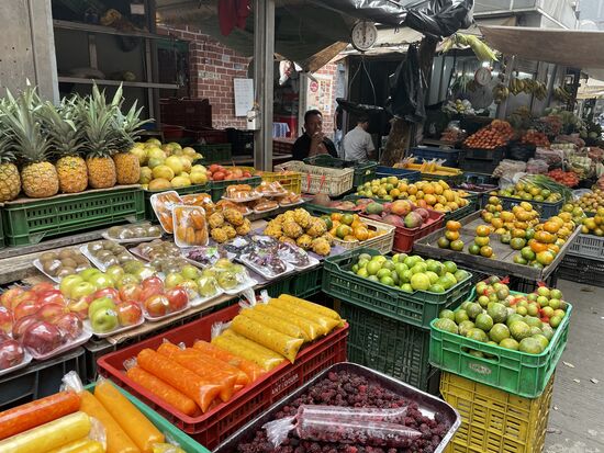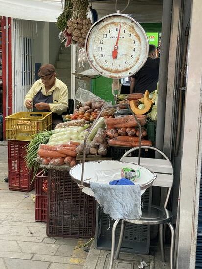 Wenn ich den Boteroplatz verlasse, komme ich zu einem Früchte- und Gemüsemarkt. Er scheint in diesen Tagen grösser geworden zu sein. Viel mehr Händler bieten ihre Waren an. Ich laufe durch die Stände, fotografiere rechts und links, komme in kurze Gespräche mit den Verkäufern, erfahre, dass die frischen Erdbeeren aus der Gegend von Cartagena kommen und dass die Äpfel importiert sind. Ich freue mich über die alten Waagen, die überall aufgehängt sind.