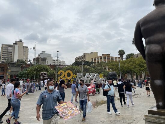 Auf dem Berrio-Platz, der auf meinem Weg zum Boteroplatz liegt, ist immer viel los. Heute spielt da eine kleine Band mit Sänger. Und die Menschen tanzen dazu. Eine kleine fröhliche Szene. Ich bleibe einen Moment stehen, nehme die lachenden Gesichter tief in mich hinein. Freue mich über die Freude der anderen. Das gehört eben auch zu Kolumbien. Diese Freude, diese Frählichkeit. Kleine Momente des Glücks.
