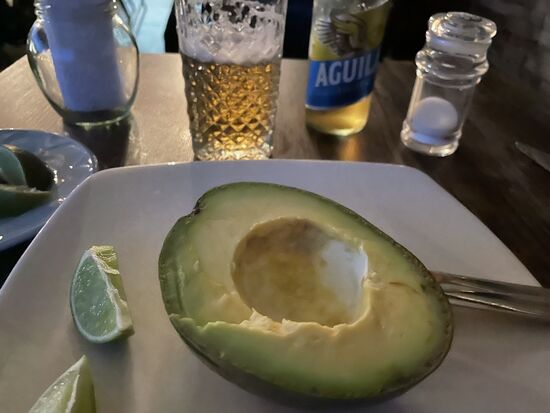 Ich habe mir heute bei einem Händler vor dem Hotel eine wunderschöne Avocado gekauft. Für einen halben Franken. Sie wird mein Nachtessen. Ich bestelle beim Kellner, Teller und Besteck und etwas Salz und Limetten. Himmlisch.