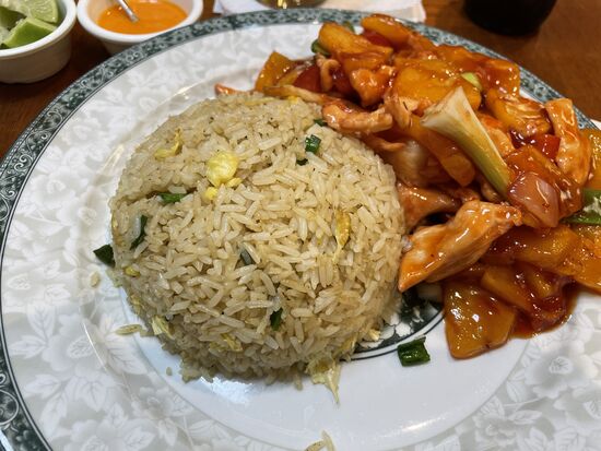 Später esse ich in einem chinesischen kleinen Restaurant. Dummerweise habe ich ein Menu ausgewählt, die Portion ist wie üblich viel zu gross. Aber es schmeckt wunderbar. Süss-sauer mit viel Ananas und gebratenem Reis.