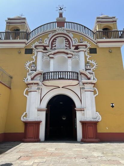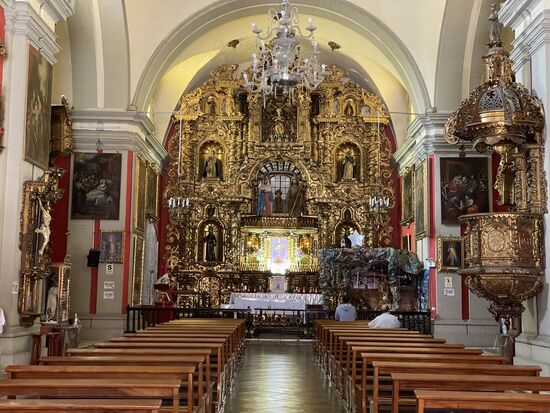 Gute 2 Stunden zeigt mein Handy an, doch das geht nur, wenn man flott unterwegs ist. Nicht wie ich, bereits bei der ersten offenen Kirche einen Stop reisst, die Kirche besucht und fotografiert. In Lima wird man - so man will - alle paar Häuser von einer Kirche gestoppt. Sie stammen vorwiegend aus der Kolonialzeit der Spanier, haben eine fantasievolle Fassade, ein grandioses Inneres. Hier bei dem Kloster Jesus, Maria und Josef ist es eine einfache weisse Fassade, der Rest des Gebäudes ist eher klassisch einfach mit dicken gelben Mauern.