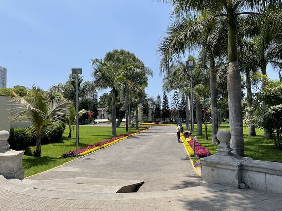 Weiter gehe ich auf meinem Weg Richtung Meer und komme bald zum riesigen Park zwischen dem Justizpalast und dem Sheraton-Hotel. Es ist ein langer Rasenstreifen mit Rabatten voller Geranien, in den Nationalfarben weiss und rot, der vom Verkehr umfahren wird. Am Ende des langen Parkes kommt der riesige Kreisel mit Miguel Grau in der Mitte. Auch er ein Nationalheld. Ja wahrscheinlich überhaupt derwichtigeste Mann des Landes. Er kämfte als Admiral um 1879 gegen Chile und gewann die meisten Seeschlachten. Heute tobt der Verkehr der Hauptstadt pausenlos um seinen riesigen Platz und überall wurden Gebäude, Plätze und Institurionen nach ihm benannt. Auf den Namen Grau stösst man in Peru überall.