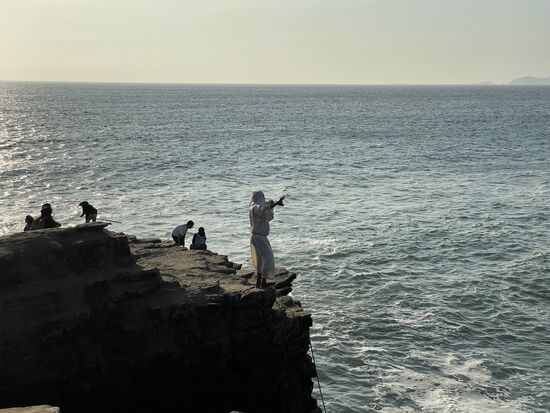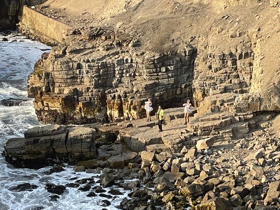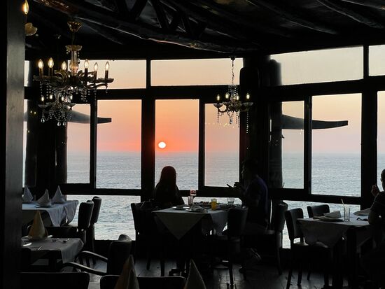 Von unserem Tisch haben wir einen perfekten Blick hinaus auf die wilde Küste, wo anscheinend grad ein Musikvideo gedreht wird. Jedenfalls ein Teil davon. Zwei junge Tänzerinnen und ein Sänger stehen unten auf einem Felsvorsprung und tanzen zu einer Musik, die nur sie hören, während über ihnen einen Drohne ihre Kreise zieht.