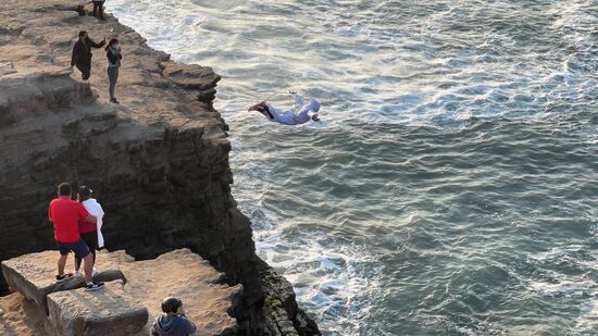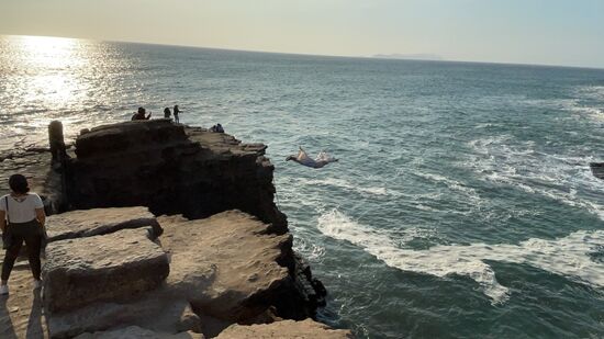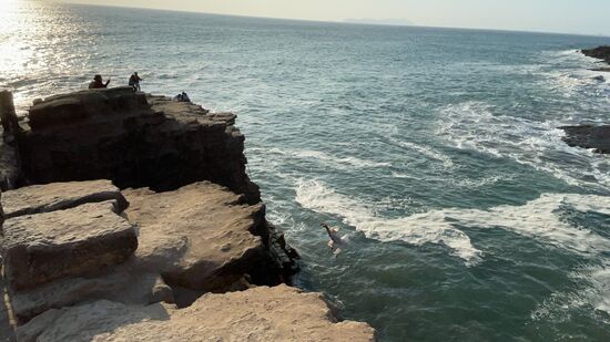 Dann steht er auf der Klippe, grüsst noch einmal in alle Himmelrichtungen und vergewissert sich, dass ich meine Kamera im Anschlag habe, Verharrt einen Moment und springt dann in die Tiefe. Dabei muss er aufpassen, dass er vom Felsen wegspringt, denn direkt unter seinem Absprungort sind Felsen. Das Meer sei dort wo er aufschlägt meistens tief genug, aber manchmal, wenn es etwas niedriger ist, muss er beim eintauchen aufpassen, dass er gleich abdreht, um nicht mit dem Kopf den Boden zu berühren.