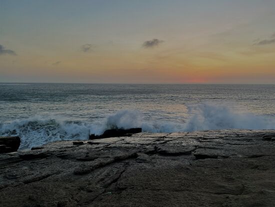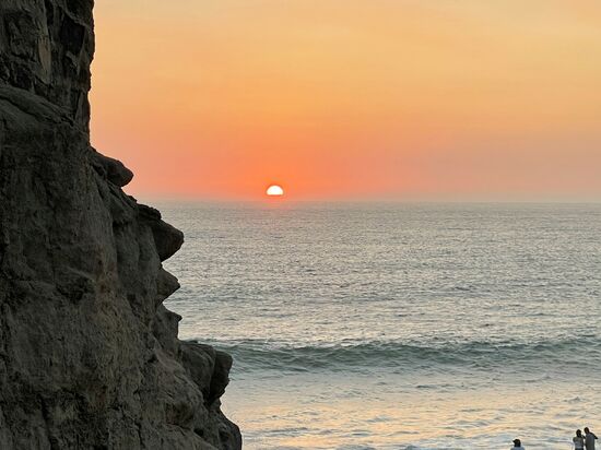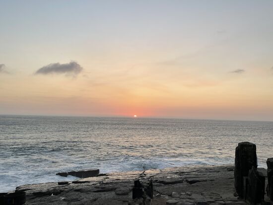 Als die Sonne glühend rot über dem Meer untergeht, gehen wir hinaus, sehen ihr die letzten Sekunden zu und bleiben noch einen Moment auf den Klippen stehen.