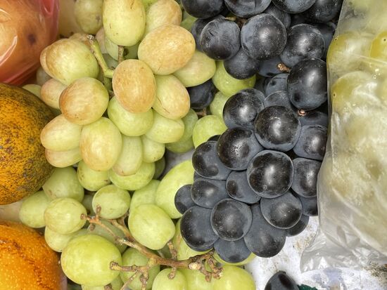 Trauben hat sie heute. Süsse blaue Trauben. Burgundertrauben, erklärt sie, und ich muss unbedingt eine probieren. Eine blaue und eine weiss und dann noch eine andere Sorte. Trauben kenne ich, versichere ich ihr. Und auch Äpfel, auch wenn es hier bestimmt wieder ganz andere Sorten hat. Eher interessiert mich die gelbe Frucht mit den Streifen. Eine Pepino.
