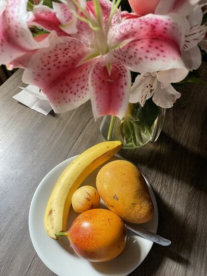 Ich versichere mich noch einmal, ob sie das mit elf Uhr ernst meint, dann verabschiede ich mich. Und bringe einen ganzen Fruchtcocktail mit ins Hotel. Mein Zimmer wird immer wohnlicher mit Blumen und Früchteschale.