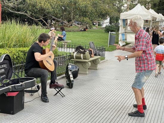 Meine Fahrt geht tatsächlich durch die ganze Stadt und endet bei La Recoleta. Hier ist der Friedhof wo Eva Peron bestattet wurde. Es ist allerdings bereits bald acht Uhr, den Friedhofsbesuch verschiebe ich, setze mich nur noch einen Moment in den Park und höre dem Gitarrenspieler zu. Und dem älteren Mann, der angeregt von den Tönen zu dirigieren anfängt. Irgendwie ergibt sich eine Symbiose zwischen den beiden, die offensichtlich nicht zusammen gehören. Mir ist nicht ganz klar, ob sich jetzt die Töne den Bewegungen des Mannes anpassen, oder ob es umgekehrt ist. Jedenfalls ein fantastisches Sujet für meine Kamera.