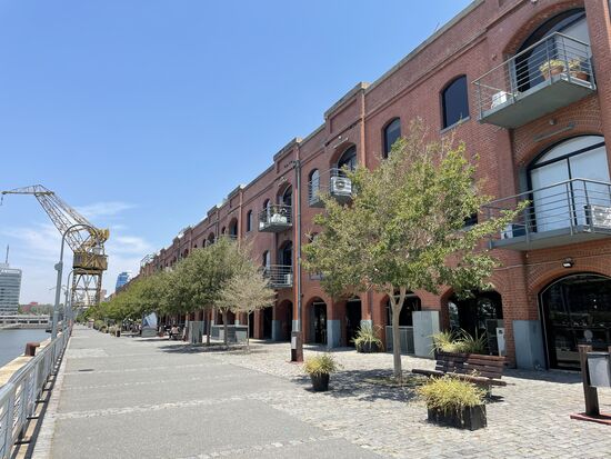 Ich gehe weiter, die Hàuser ändern sich. Jetzt sind es herrschaftliche Fassaden, grosse Häuser, breitere Strassen. Irgendwann bin ich bei den Hafenkränen. Es ist heiss, doch das Wasser verleiht wenigstens optisch etwas Abkühlung.