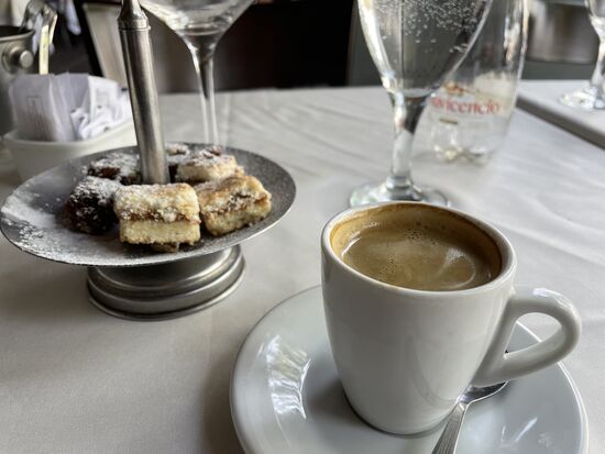Unter den Balustraden der langen Backsteinhäuser gibt es ein paar schöne elegante Restaurant. In einem kehre ich ein und bestelle das Menu. Es wird ein opulenten Mittagessen, das ich heute ausführlich geniesse.