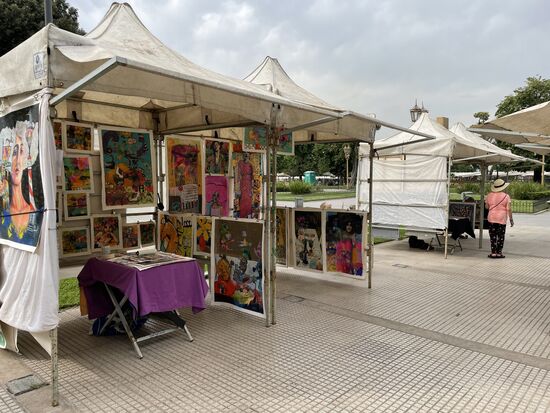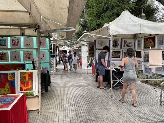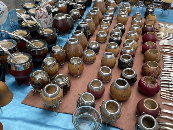 Was hier immer und überall dazu gehört, ist der Mate-Tee. Taxifahrer haben ihre Thermosflasche und einen vollen Becher neben sich auf der Ablage, an Schaltern habe ich die schönen Becher neben den Computerbildschirmen auch schon oft entdeckt und bei meinen Spaziergängen sehe ich oft Männer mit grossen Handtaschen. Darin ist das heisse Wasser und der Becher untergebracht. Ausserdem gehört noch ein spezielles Silberröhrchen dazu, das unten zu einem Sieb in Löffelform gestaltet ist. Dadurch wird der Tee gesippt. Noch habe ich keinen direkten Kontakt mit dem Getränkt bekommen, aber heute auf dem Markt fallen mir die Stände mit den wunderschönen Bechern auf.