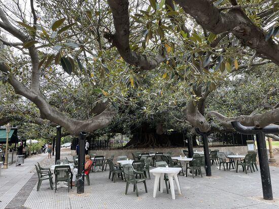 Ich schlendere noch ein wenig durch die vielen Stände wo Bilder verkauft werden und setze mich dann unter den Baum mit den riesigen Ästen. Unglaublich, wie weit sich die schweren Äste ausbreiten. Sie bedecken das ganze Restaurant und dabei ist der Baum eigentlich ganz niedrig. Ich habe den Kellner nach dem Namen des Baumes gefragt, hab ihn aber leider nicht aufgeschrieben. Auf jeden Fall ist es eine Gummibaumart. Der Baum ist mir auch an anderen Orten in der Stadt schon aufgefallen, aber dieser scheint nun tatsächlich der grösste seiner Art zu sein.