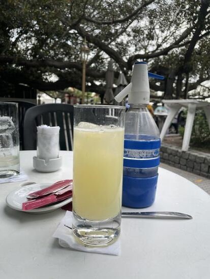 Ich bestelle eine frische Limonade und bekomme reinen Zitronensaft mit einer Flasche Soda und Zucker. So habe ich das noch nie bekommen. Ich staune immer wieder, wie die gleiche Bestellung überall anders serviert wird. So wie ein Capuccino jedesmal anders daher kommt. Ich mische mir jetzt also meine Limonade selber. Den Durst nimmt sie auf jeden Fall, und kühl ist sie auch, denn im Zitronensaft hat es Eiswürfel.