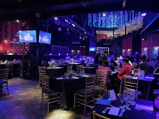 Kurz nach acht Uhr holt mich der Bus ab. Wir sammeln noch ein paar weitere Passagiere ein und nach Einbruch der Dämmerung kommen wir bei der Eventhalle an. Sie ist gar nicht weit weg vom Restaurant wo ich gestern so fein gegessen habe.