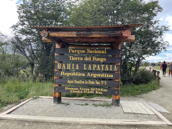 Es hat wieder aufgehört zu regnen, als wir bei einem Parkplatz ankommen. Hier endet die Route National, die durch ganz Argentinien führt. 3079 km sind es von hier bis Buenos Aires, oder gar 17848 bis Alaska, bis zum Beginn der Panamericana, auf der ich zu Beginn meiner Reise in Lima und Kolumbien öfters unterwegs gewesen bin und die in Chile einen abrupten Wechsel von der West- zur Ostküste direkt nach Buenos Aires und dann als Nationalstrasse 3 bis hier in die Bahia Lapataia führt. Irgendwie ein eindrücklicher Punkt. wenn man sich die Strecke auf einer Karte von Nord- und Südamerika vorstellt.