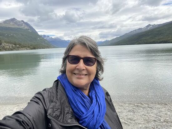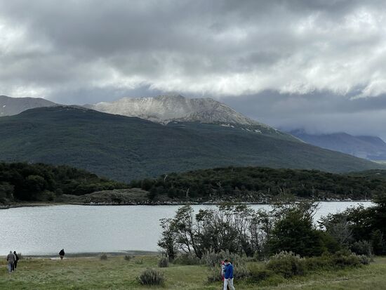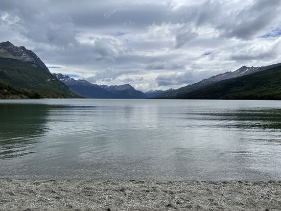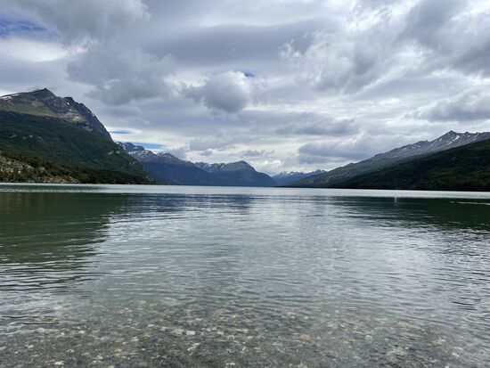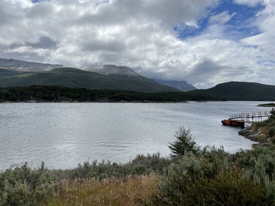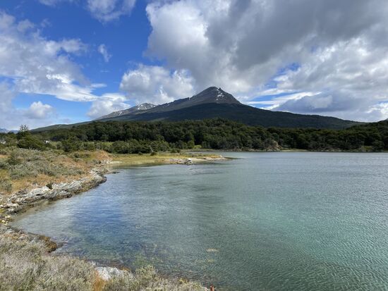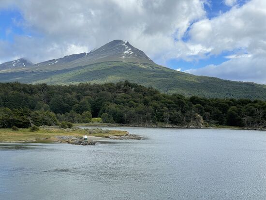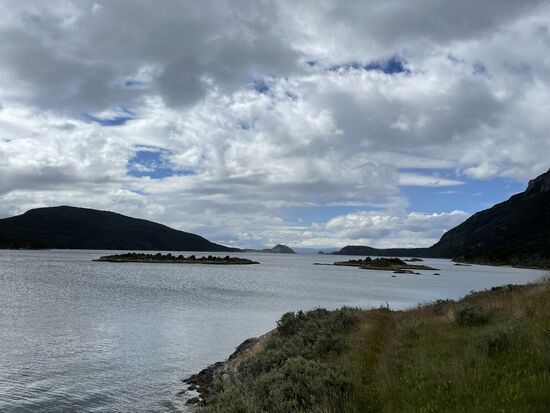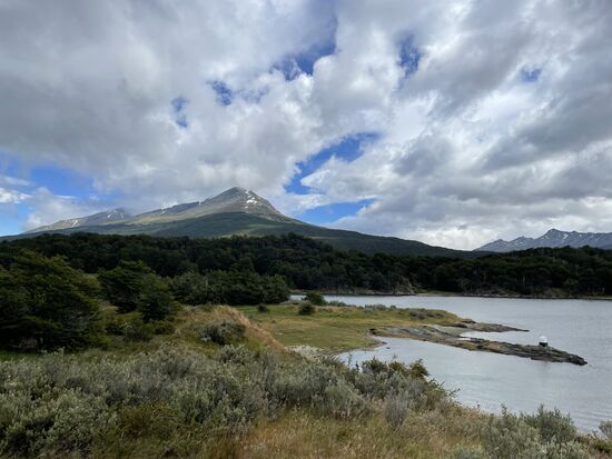 Von hier gibt es einen Wanderweg, der zur La Pataia-Bucht führt, die Teil des Beagle-Kanals ist. Es weht ein kühler Wind, wir sind alle in Jacken und Schals eingehüllt und auch ich bin froh, dass ich meinen blauen Tuarec-Schal aus Marokko dabei habe. Der Wind peitscht über die Wiesen, die Wolken reissen auf, es ist ein wunderschöner Tag. Vor allem als hinter den Wolken eindrückliche Berge hervorkommen. Zum Teil kann man dort hoch oben Schneefelder entdecken.