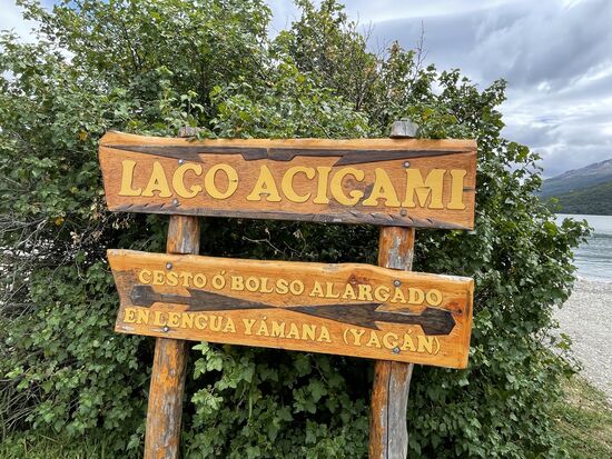 Nach dem kurzen Spaziergang fahren wir weiter, halten kurz bei einem Informationsstand, wo es Toiletten gibt und fahren dann weiter zum Acigami-See. Auch hier wieder sind wir ganz nahe der chilenischen Grenze. Die Berge auf der anderen Seite des Sees gehören zu Chile.