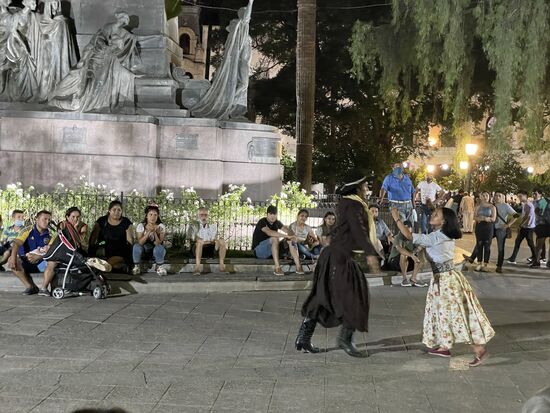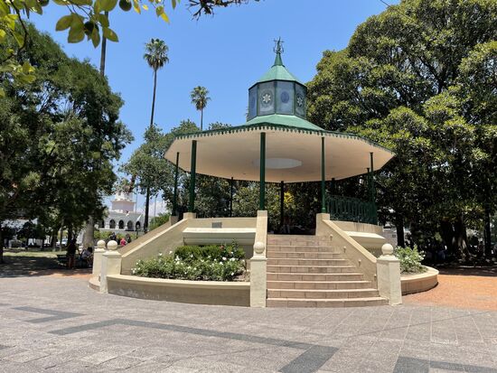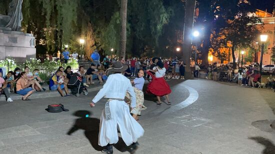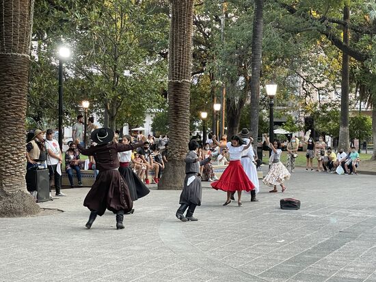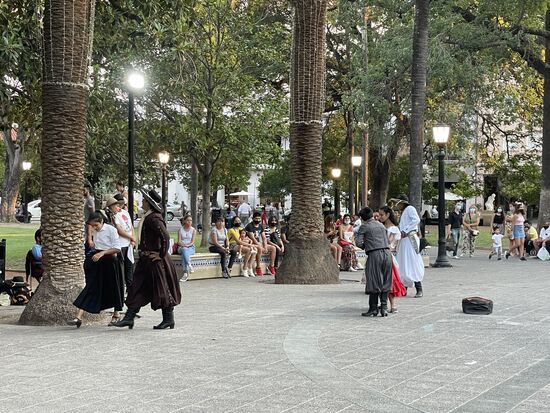 Unter den Bäumen im Park tanzen die jungen Leute wieder. Das ist eine wunderbare Einladung, mich auf eine Mauer zu setzen und einfach zuzusehen. Es sind ganz junge Tänzer und man sieht ihnen die Begeisterung und Freude an, hier vor einem grösseren Publikum aufzutreten. Zwischendruch will der Moderator wissen, woher die Zuschauer kommen. Sie kommen aus ganz Argentinien, aus Cordoba, Buenos Aires, aus Santa Cruz, Mendoza. Jede Provint wird beklatscht. Ausländer melden sich keine, ich weiss nicht, ob ich die einzige Europäerin bin, aber es meldet sich niemand aus dem Ausland. Ich zwar auch nicht, so dass das keine definitive Aussage sein kann.