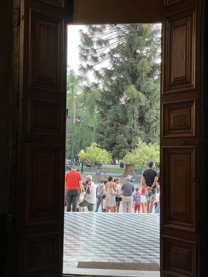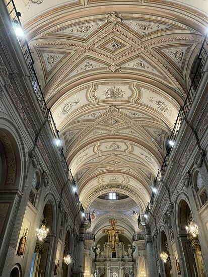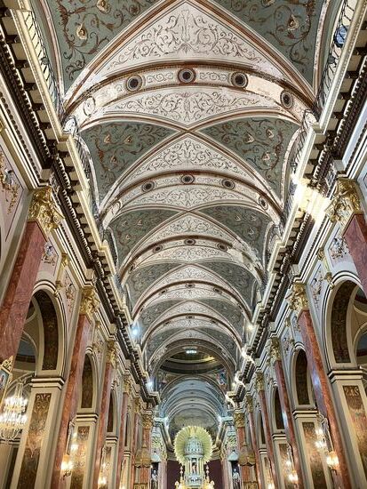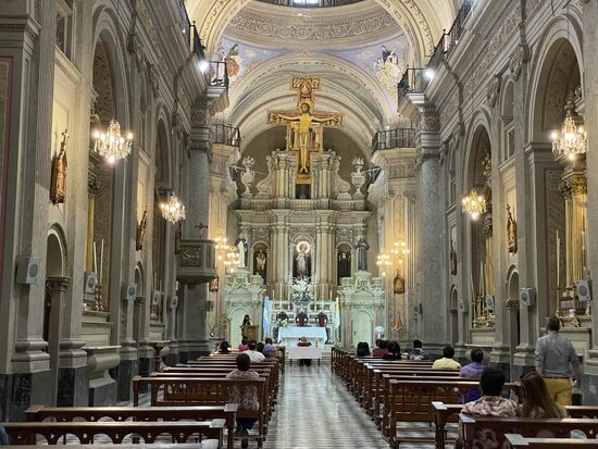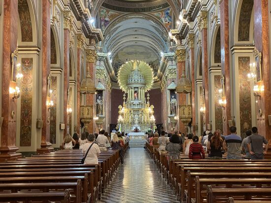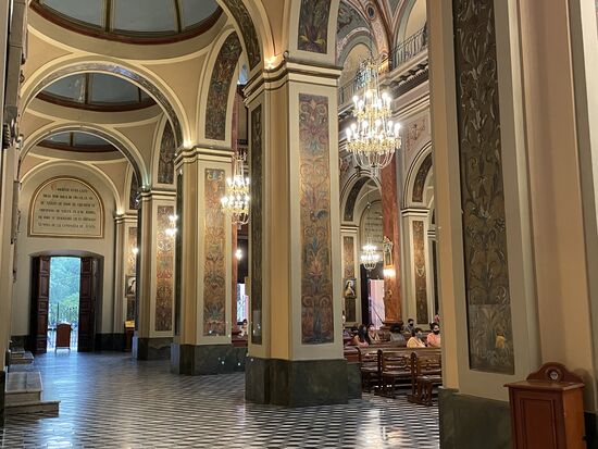Heute ist das Tor der Kathedrale offen, es wird eine Messe gefeiert. Ich gehe hinein und bin wieder einmal erstaunt ob dem Prunk. Es ist eine ausgesprochen opulente Dekoration mit den rosaroten Pseudo-Marmorsäulen, dem goldenen Stuck, den in einen Teil der Säulen eingelassenen Reliefen und dem strahlenden Altar. In den Seitengängen hängen riesige Leuchter, an den Säulen diskretere Lampen und die Decke mit ihren geometrischen Mustern aus Dreiecken und Kreisen in beige und grün ist ebenfalls eine Augenweide.