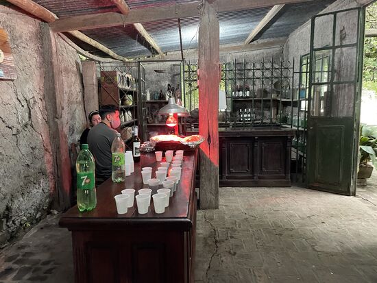 Es gibt einen kleinen Laden, der in einem alten Eisenbahnwagen untergebracht ist. Da kann man Ponchos kaufen oder die schön verzierten Becher mit dem speziellen Löffel für den Mate-Tee. Versuchen können wir ihn nicht, denn er wird reihum aus dem gleichen Becher getrunken, mit dem gleichen Röhrchen. Juan, unser Guia hat uns auf der Fahrt davon erzählt und ich kenne den Mate eh schon von meinem früheren Aufenthalt. In Paraguay wird er übrigens kalt getrunken, dort heisst er Terere. In meinen letzten Reisebericht aus Paraguay habe ich von einer typischen Terere-Runde erzählt. Das war im Oktober 2019, ein paar Monate vor Corona.
