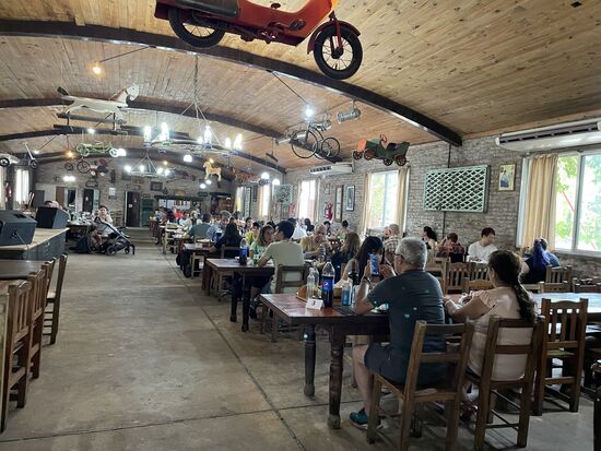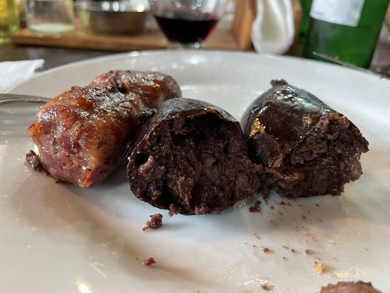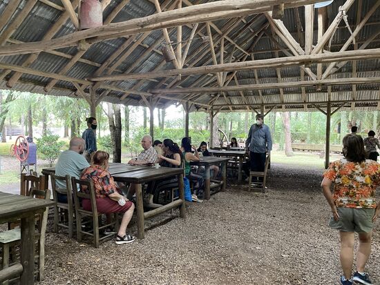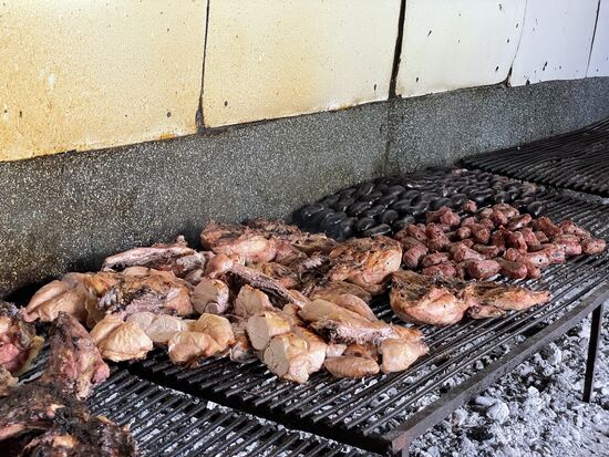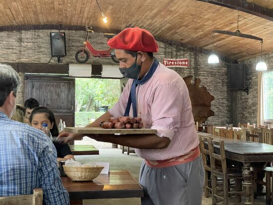 Auf den Tischen stehen Weinflaschen und kleine Salatteller mit knusprigem Brot. Bald kommen die Gauchos mit dem Hauptgang. Zuerst gibt es Würste vom Grill. Eine grobe Blutwurst und eine etwas fettige Bratwurst. Und dann folgen die verschiedenen Fleischsorten: Hühnchen, Schwein und Rindfleisch. Und zwar in riesigen Portionen, so dass die meisten schon bald abwinken. Argentinien ist ein ausgesprochenes Fleischland. Zwar wurden wir auf der Hinfahrt gefragt, ob jemand Vegetarier sei, aber bestimmt ist man froh, dass niemand sich gemeldet hat. Jedenfalls schmeckt alles wunderbar. Und ja, ein paar Pommes gab es auch noch dazu.