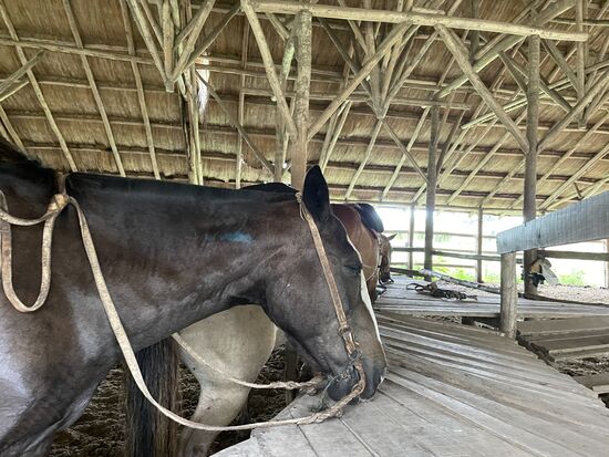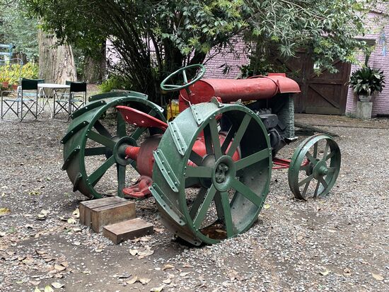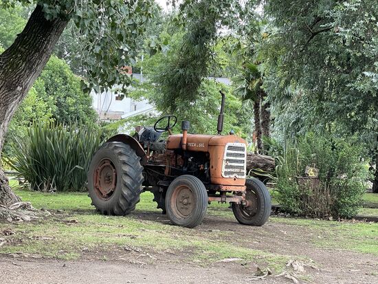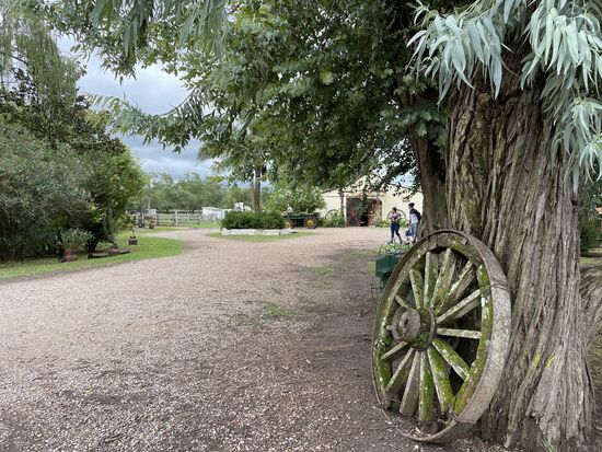 Nach der Kutschenfahrt bleibt noch etwas Zeit, sich auf der Ranch umzusehen. Ich entdecke alte Gerätschaften, Wagenräder, die einen kleinen Traktor und viele hohe Bäume die willkommenen Schatten spenden. Zwar brennt die Sonne heute nicht vom Himmel. Dieser ist vorwiegend bedeckt, aber es ist trotzdem ziemlich heiss und feucht.
