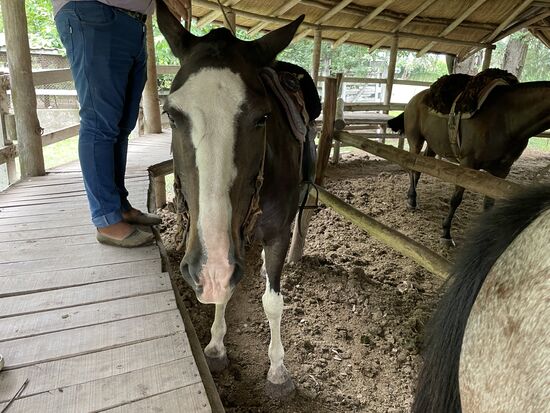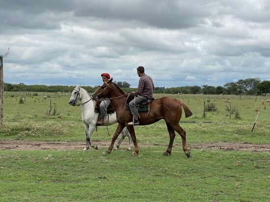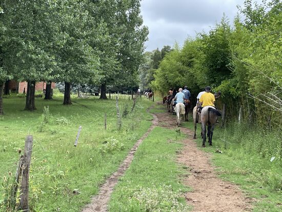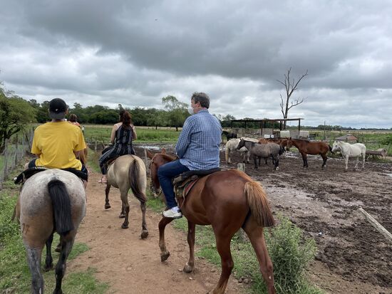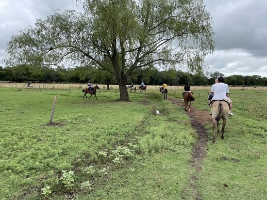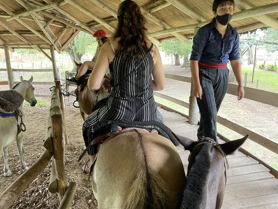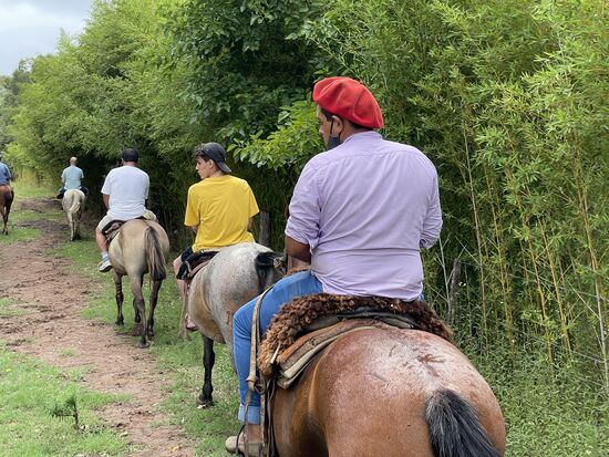 Die Pferde stehen gesattelt bereit, das Aufsteigen ist perfekt organisiert mit einem hohen Steg neben den Pferden, so dass wir alle aufsteigen können. Mein Pferd ist die Luna. Sie scheint sehr ruhig zu sein und ich bin ganz froh, dass sie einfach den anderen hinterhertrottet. Galoppieren und traben sei nicht gestattet, meint einer der beiden Gauchos, die uns anführen. Der Ausritt dauert kurz, ist aber eine sehr schöne Erfahrung. Einmal mehr auf einem Pferd zu sitzen. Reiten würde ich das nicht wirklich nennen, aber es fühlt sich wenigstens so an. Das Gelände ist grossflächig, wir kommen über eine kleine Brücke auf eine Weide, wo die Sonne heiss brennt, gehen am Bambushain entlang und unter den alten Eukalyptusbäumen führt der Weg zurück in den Stall.