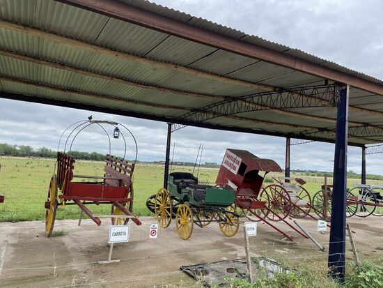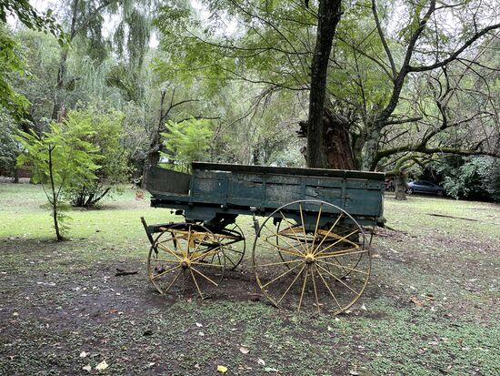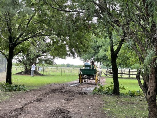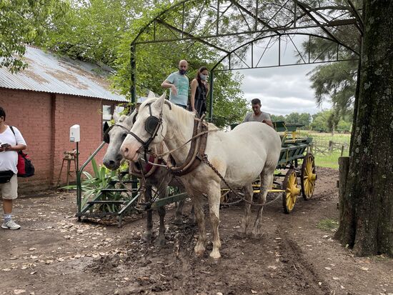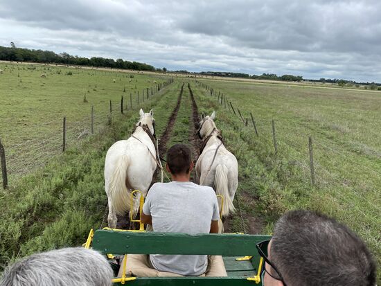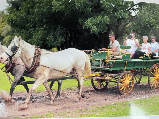 Nächster Programmpunkt im Gauchoprogramm ist die Kutschenfahrt. Zwei Schimmel ziehen den Pritschenwagen mit dem wir einen weiten Kreis ziehen. Wir kommen an der grossen Weide mit den Schafen vorbei. Auch sehen wir am Weg alle alten Kutschen, die auf der Ranch zum Einsatz gekommen sind. Wahrscheinlich sind einige davon auch jetzt noch in Betrieb, wenn wieder mehr Touristen kommen. Bestimmt waren da vor der Pandemie jeden Tag viel mehr Leute zu Besuch.