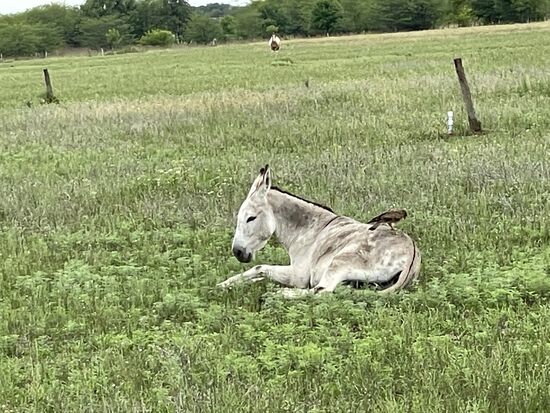 Auf einem Pfahl sitzt ein brauner Adler. Er scheint ebenfalls zu dem Hof zu gehören, jedenfalls schwebt er hinüber zu den Eseln und setzt sich einem auf den Rücken, fängt an, ihn zu putzen, indem er sein Fell nach Insekten untersucht.