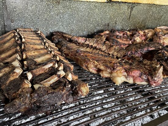 Auf meinem Rundgang komme ich auch zur offenen Küche, wo der Koch das Fleisch auf dem grossen Grill kontrolliert. Eigentlich würde zu einem richtigen Asado, einem Grillfest ein bis zwei Rinder über das Feuer gehören, doch es sind wohl zu wenig Leute hier, als dass sich das lohnen würde. Die Fleischauswahl ist aber trotzdem sehr eindrücklich.