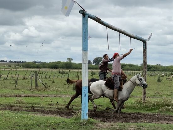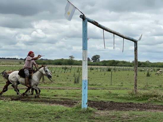 An den Stangen, die von einem Tor hängen, werden Ringe aufgesteckt. Die Aufgabe ist es, im Galopp den Ring mit einem Stecken von der Stange einzufangen und den Zuschauern zu bringen. Eigentlich soll das eine spezielle Huldigung für die Angebetete sein, die den Reiter dann mit einem Kuss belohnen würde. Es könnte der Auftackt für eine Hochzeit sein, doch unsere Moderatorin meint, die Gauchos würden lieber die Freiheit wählen, sie wären mit einem Kuss an das Pferd zufrieden. Denn beide wären zur Zeit noch ungebunden.