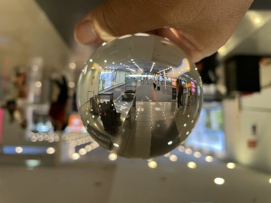 Beim Scannen des Handgepäcks muss ich wieder einmal meine Kristallkugel hervorholen. Immer wieder sorgt sie für Irritationen. Ich muss den Rucksack öffnen und die Angestellten am Scanner wollen wissen, was dieses Glasding ist und wozu ich es brauche. Also ergibt sich noch eine spontane Kugelfoto der Kontrollhalle.