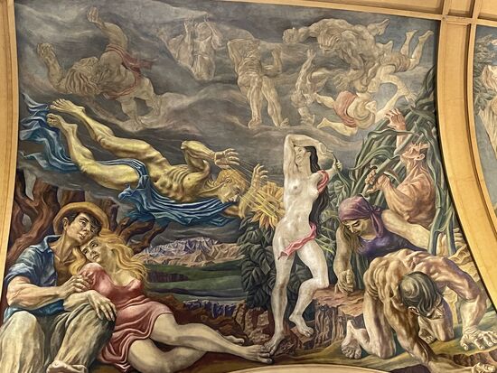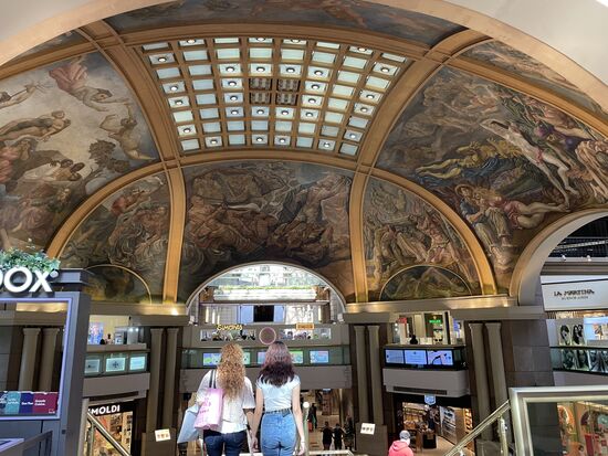 Ich lasse mich bei der bekanntensten Einkaufsgalerie absetzen. Die Galerias Pacifico ist ein quadratsicher Gebäudekomplex mit pompösen Eingängen an allen vier Seiten. In der Mitte befindet sich eine grosse Kuppel mit einem riesigen Fresko. Bilder wie in einer Kirche, aber die Galerie war von Anfang an als Einkaufstempel geplant. Im unteren Stockwerk gibt es einen Springbrunnen, darüber kommt die Gemäldekuppel und über dem ganzen gibt es eine Glaskuppel, und Glasdächer, die genügend Licht bis ins Untergeschoss einlassen.