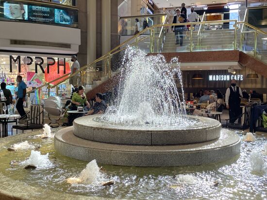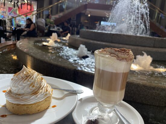Ich setze mich ins Cafe beim Springbrunnen im Parterre und geniesse einen letzten zuckersüssen Lemon Pie. Zusammen mit dem Cappuccino mit Schlagsahne füllt der mir den Magen so, dass ich heute nichts mehr zu essen brauche. Danach schlendere ich durch die Fussgängerpassage zurück in meine Unterkunft, wo ich mich etwas ausruhe und noch einmal versuche, mich mit dem Blog zu befassen.