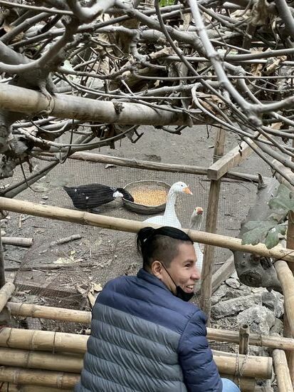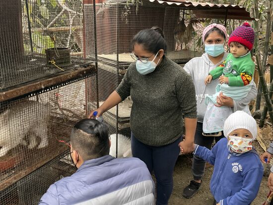 "Schau mal, dieses Kaninchen ist traurig", erzählt mir Daniel, einer der Buben. "Ja, kein Wunder, das lebt hier ganz allein und ausserdem steht es auf einem Gitter, das tut ihm bestimmt weh." Tierhaltung ist hier eben völlig anders als bei uns, auch wenn man Tiere mag. Vor allem Enrique scheint Tiere zu mögen. Schnell hat er den kleinen Hundewelpen entdeckt, den eine junge Frau dabei hat. Auch mit den Kaninchen nimmt er Kontakt auf und mit den Gänsen auf dem Rückweg unterhält er sich einen Moment.