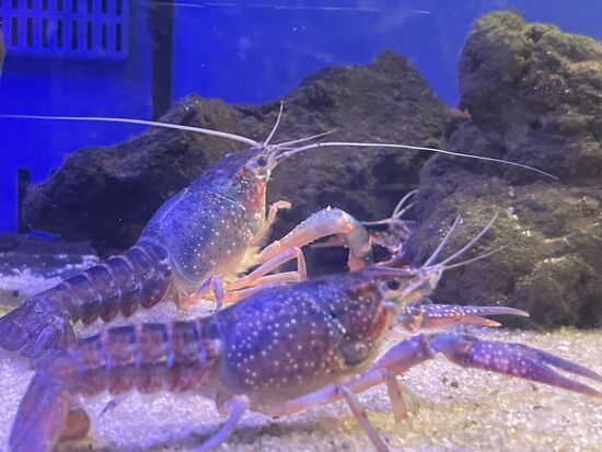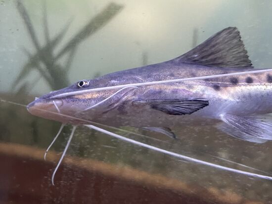 Sie zeigt uns den Haifisch, der in seinem kleinen Becken in der Mitte des Hofes allein seine Runden dreht. Dann zeigt sie uns die Amazonas-Fische mit dem eindrücklichen Zitteraal, dem man in der Natur besser nicht begegnet, denn eine Begegnung mit seinen 600 Volt überlebt man wohl kaum. Ausserdem gibt es Paiche, die grössten Süsswasserfilsche. Die Exemplare, die hier in der Vitrine schwimmen, haben allerdings mit den riesigen Fischen, die im Amazonas schwimmen, kaum was zu tun. Ein eindrücklicher Brocken ist der Bartfisch. Er hat seinen Namen von den schnauzformigen Auswüchsen des Kiefers und er macht einen sehr bärbeissigen Eindruck, wie er da so hin und her schwimmt.