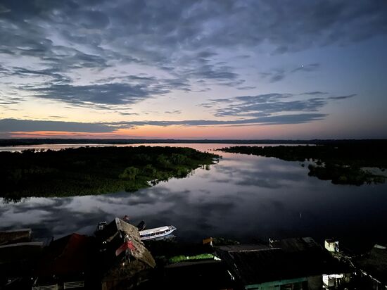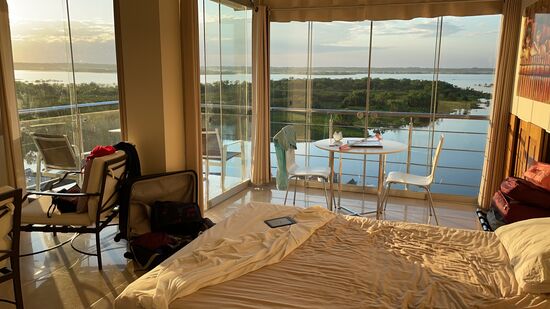 Und wie ich aufgehoben bin! Das Zimmer ist noch schöner, als es im Internet ausgeschrieben war. Und die Aussicht über den Fuss Itaya einfach fantastisch. Der Amazonas geht weiter draussen vorbei, der Fluss Itaya hat sich im Laufe der Zeit als Nebenfluss gebildet, früher lag Iquitos direkt am Amazonas. Doch der Fluss ist auf seiner ganzen Länge nirgends eingedämmt, er hat im Laufe der Jahre seine Form verändert. Es gibt auch auf den ganzen gut 5000 km von seinem Ursprung in den Anden bis zum Delta bei Belem in Brasilien keine einzige Brücke, die über den Amazonas führt. Die grossen Städte, Iquitos in Peru und Manaus in Brasilien liegen beide an der linken Flussseite. Um auf die andere Seite des Flusses zu gelangen braucht man ein Boot.