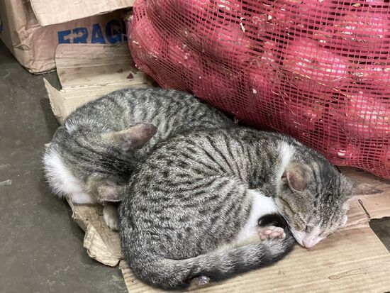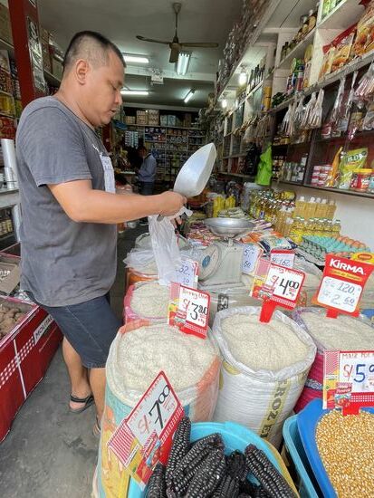 Der Händler stellt die grosse Waage kurzerhand auf einen der Reissäcke und füllt mit der Schaufel den Reis in Plastiksäcke. Zwanzig Kilogramm. Dazu Zwiebeln, Knoblauch, Salz ein paar Liter Öl. Und ein paar Kilogramm Kartoffeln.