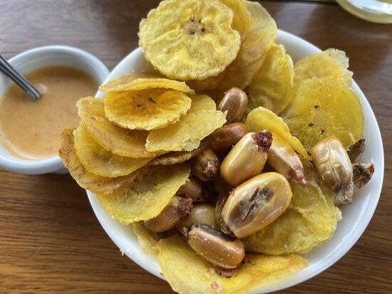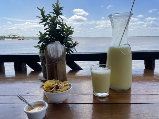 Hier in Iquitos trinkt man vorwiegend Fruchtsäfte. Man erkundigt sich nach dem Angebot und wählt zwischen Camu Camu, Maracuya (Passionsfrucht), Pina (Ananas), Carambola (Sternfrucht), Mango, Papaya oder einfach einer frischen Limonade mit viel Zitronensaft. Dazu gibt es frittierte Bananenscheiben und gerösteter Mais. Eine andere Welt eben.
