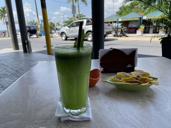 Trotzdem weiss ich heute gar nicht richtig, was ich mit mir anfangen soll. Bin schon bei Sonnenaufgang wach und gehe früh auf den Bulevard zum Frühstück. Ein richtig feines gesundes Müesli mit einem Spinat-Yoghurt. Ja, das mit dem Spinat habe ich zu spät entdeckt, nämlich erst, als ich die Kerne unter gemischt hatte, aber da war es bereits zu spät. Hat aber trotzdem sehr gut geschmeckt, das knallgrüne Yoghurt. Und war bestimmt sehr gesund. Das ist übrigens keine peruanische Spezialität, eher eine amerikanische, denn das Dawn on the Amazon versucht den Spagat zwischen peruanischer Küche und amerikanischem Health-Food.