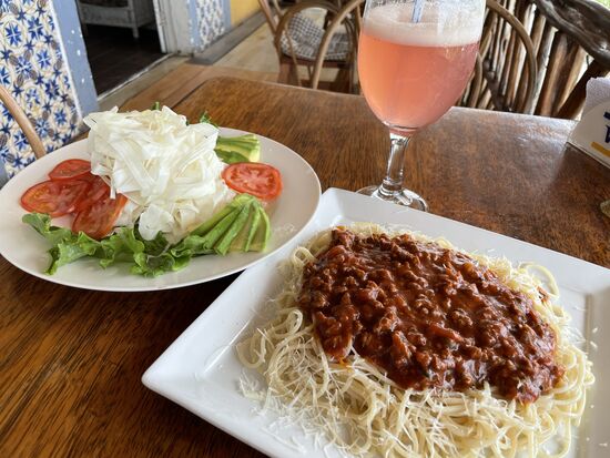 Und dann gibt es eigentlich nur noch warten. Und warten verkürzt man sich am Besten mit etwas essen. Wer weiss, was es in den nächsten Tagen zu essen gibt, ich stelle mich auf Schonkost, respektive Diät ein. Im Moment aber setze ich mich in mein Lieblingsrestaurant. Auf dem Balkon vom La Notte kann ich den Bulevard überblicken und in Ruhe Spaghetti Bolognese mit einem feinen Salat aus Palmherzen, Tomaten und Avocado geniessen. Dazu einen Camu Camu-Saft.