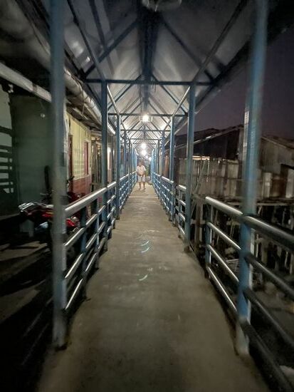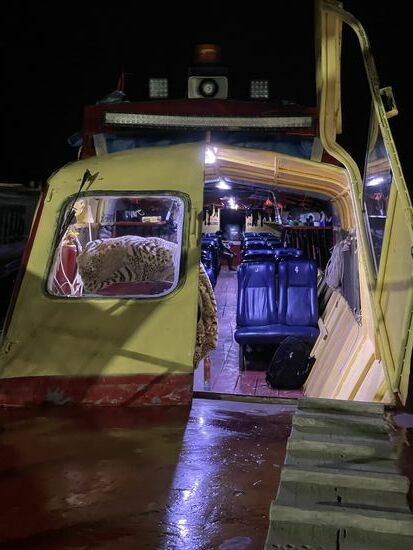Und wo sind wir? Noch gibt es ein paar wenige Lampen, die die Brücke beleuchten, über die wir hinauf an Land gelangen, doch dort herrscht Dunkelheit. Meine Vorstellung von wartenden Mototaxis, die uns zu einer Unterkunft bringen würden, muss ich gleich streichen. Da ist niemand. Die wenigen Passagiere sind irgendwo in der Dunkelheit verschwunden, wurden vielleicht erwartet oder sind hier zu Hause. Doch auf uns hat niemand gewartet. Es ist lang nach Mitternacht und es ist stockfinster. Mit den Handys versuchen wir zu ergründen, wo wir sind. Machen ein paar Schritte auf der Strasse, als wir links vor uns auf einem erhöhten Gehweg zwei Gestalten erkennen.