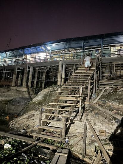 Um acht fährt das Schnellboot, Liborio holt mich um sieben ab. Ob ich diesen Schiffssteg allein gefunden hätte, möchte ich bezweifeln. Jedenfalls ist alles ziemlich schummerig, als wir durch die schmale Gasse Richtung Fluss gehen. Es ist überhaupt alles sehr gespenstisch. Die langen Stege und vor allem die steile Holztreppe mit den unreglmässig hohen Tritten, die im unteren Teil nicht einmal mehr ein Geländer hat. Da ist es gut, dass Liborio die Tasche mit der Hängematte und den anderen Sachen trägt, die nicht mehr in den Rucksack passten. Ich bin mit diesem auf der steilen Treppe schon sehr gefordert.