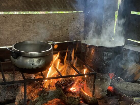 Als erstes kommt Lyvia in die Küche, schürt das Feuer, setzt einen Topf Wasser auf. Danach geht sie hinaus, rüstet Yucca und fängt an, diese zu raffeln. Vorbereitungen für die nächste Brotbackaktion. Liborio kommt und sucht mein Moskitonetz nach Insekten ab. Er findet tatsächlich die eine oder andere, die versucht, raus zu kommen.