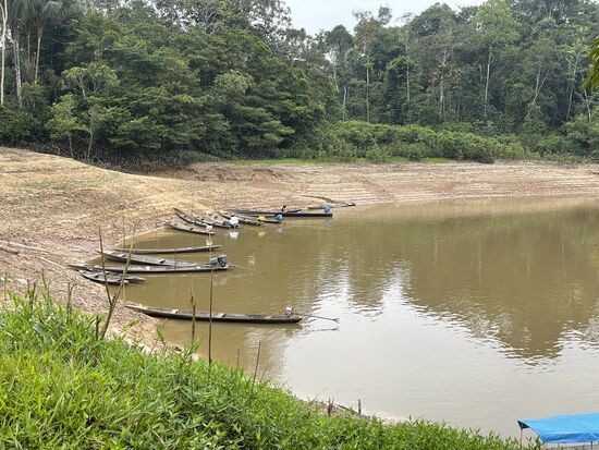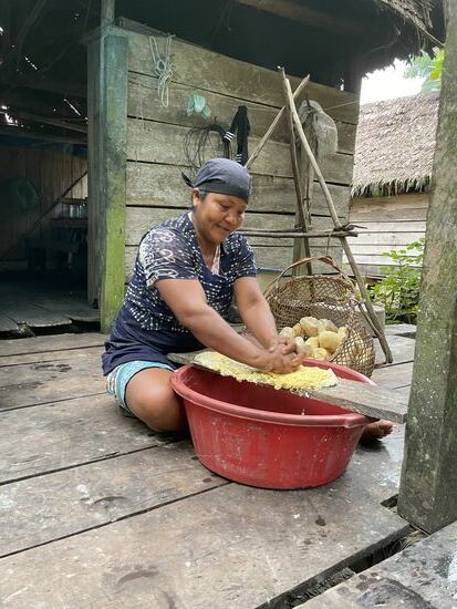 Dazu brät mir Rosa zwei Spiegeleier und ein paar Kochbananen. Mein Frühstück. Wer sich übrigens noch für das Brot von gestern interessiert. Es besteht nur und ausschliesslich aus Yuccamehl, das mit dem Wasser des Flusses gemacht wurde. Kein Salz. Es schmeckt daher ziemlich fade und ich lasse es besser bleiben. Das mit dem Flusswasser ist mir suspekt, auch wenn es abgekocht ist. Aus dem gleichen Gund versuche ich auch nur einen kleinen Schluck des Getränkes, das Lyvia gestern aus den Palmfrüchten gemacht hat. Wir haben zwar genügend Wasser in Flaschen mitgebracht, aber Lyvia verwendet für sich und die Familie ausschliesslich Flusswasser, das zum Teil etwas länger in den Bottichen steht, so dass sich die Sedimente setzen können.
