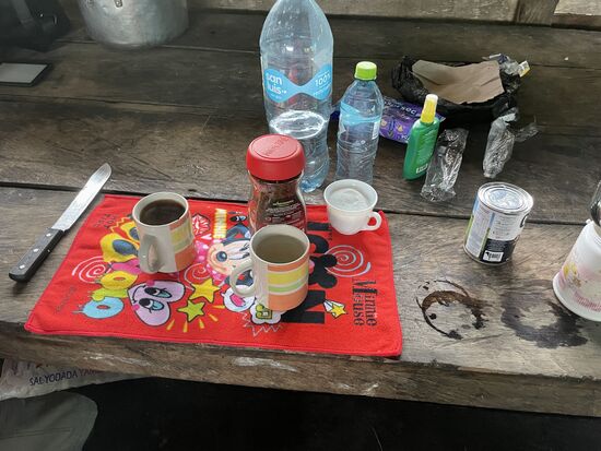Als ich zurück komme, ist mein Tisch gedeckt, Extra für mich hat Rosa Kaffee mitgebracht und Kondensmilch. Dass ich eigentlich ganz gut auf Instantkaffee verzichten kann, darf ich jetzt nicht sagen, denn der Kaffee ist nur für mich, wird hier kaum getrunken.