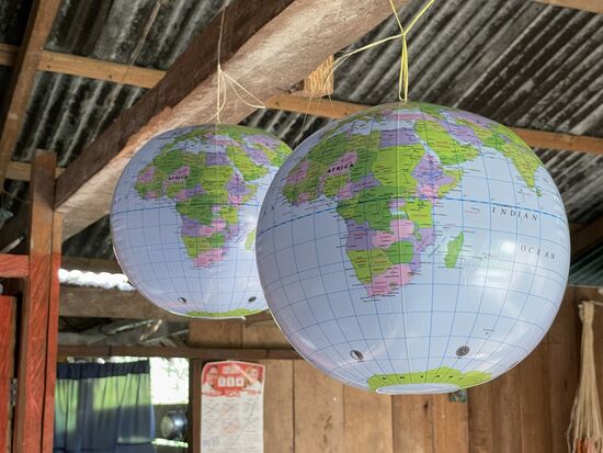 Vor allem die Kinder interessieren sich für den Globus und Belen fragt, ob ich noch einen zweiten hätte, sie möchte ihn gern zur Schule mitnehmen, wenn die am Montag wieder beginnt. Später sehe ich, dass sie die beiden Bälle aufgehängt hat, was mich spontan dazu bringt, ihr zu erklären, dass dieses Bild nicht der Realität entspricht, dass wir nur eine Welt haben, für die wir Sorge tragen müssen.