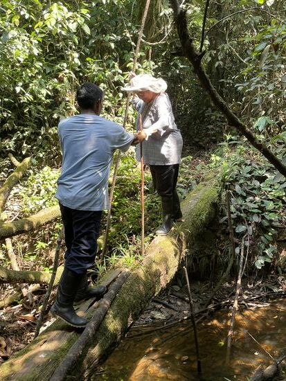 Wir dringen immer tiefer in den Wald hinein, überqueren kleine Wasserläufe, mit Baumstämmen als Brücken, die mein Gleichgewicht herausfordern, es wird zunehmend heiss und ich merke, dass ich vergessen habe, meine Wasserflasche mitzubringen. "Gibt es nicht irgendwo diese Lianen, die immer Wasser spenden?" will ich wissen und natürlich findet Juan ganz schnell eine dieser praktischen Pflanzen und haut mit seiner Machete ein entsprechendes Stück heraus. Leider reicht das nur für kurze Zeit, mein Akku wird langsam leer und ich denke daran, dass wir den Weg ja auch wieder zurück gehen müssen.